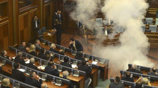 Parlamentarios opositores lanzaron gas lacrimógeno en una protesta registrada durante una sesión del Parlamento en Pristina, capital de Kosovo.
