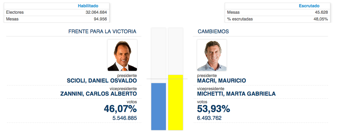 #ArgentinaVoto2015 Macri lidera parcialmente votación con 53,93% (48,05% escrutado)