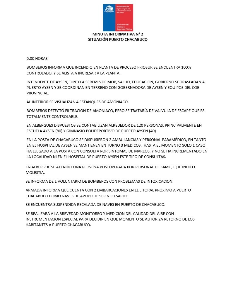 Nuevo reporte con actualización de información sobre situación de incendio 100% controlado en Planta FrioSur de Puerto Chacabuco