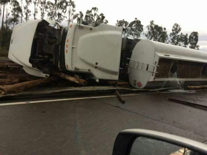 Según se ha indicado y por motivos que aún son materia de investigación, un camión maderero colisionó con otro que transportaba combustible, resultando uno de ellos volcado entre las pistas.