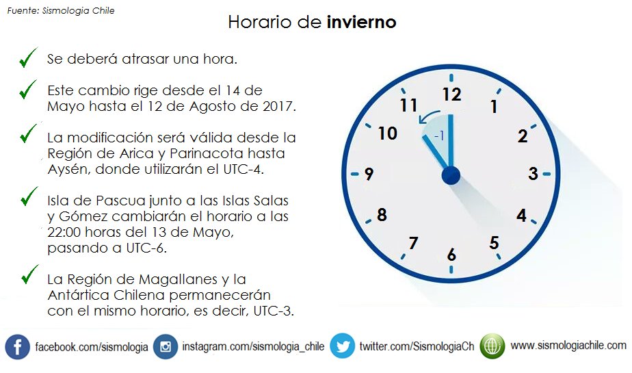 Este 14 de Mayo todo Chile (excepto la Región de Magallanes y la Antártica Chilena) deberá atrasar una hora los relojes. #HorarioDeInvierno.