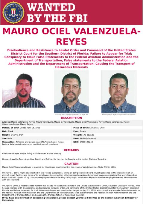 La embajada de Estados Unidos a través de Twitter y de su página oficial de internet recordó que el FBI sigue en la búsqueda del chileno Mauro Ociel Valenzuela, de 48 años, quien es responsabilizado de un accidente aéreo de la empresa Valujet ocurrido el 11 de mayo de 1996, donde murieron 110 personas en Florida.
